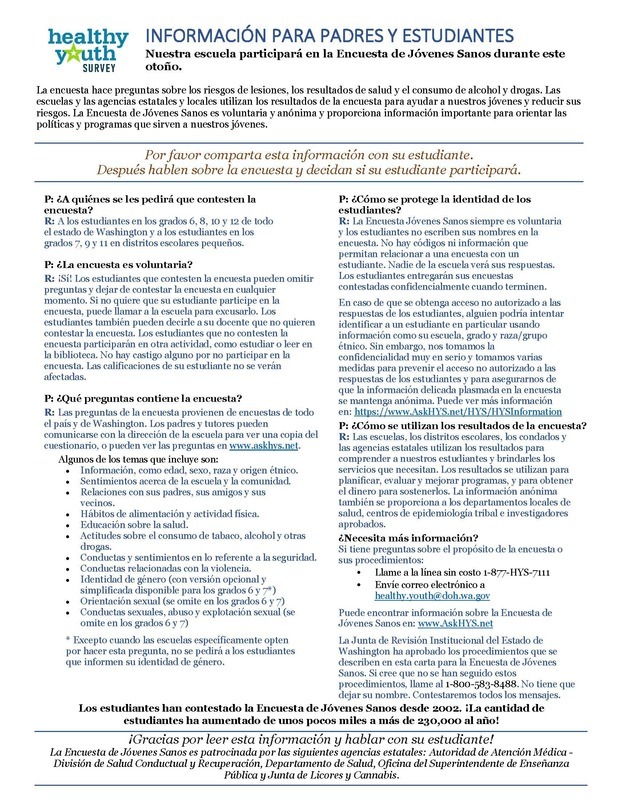 The Prosser School District is participating in the Washington State Healthy Youth Survey this fall. The survey will be given to students in Grades 6, 8, 10, and 12. The Healthy Youth Survey includes questions related to physical activity and diet, unintentional and intentional injury, substance use, sexual behaviors, abuse, risk and protective factors, and access to school-based services. Survey results are used by schools, communities, and state agencies to plan programs to support our youth and reduce their risks. Participation in the survey is voluntary and the students’ answers are anonymous. There are no codes or information used to match a survey to a student.